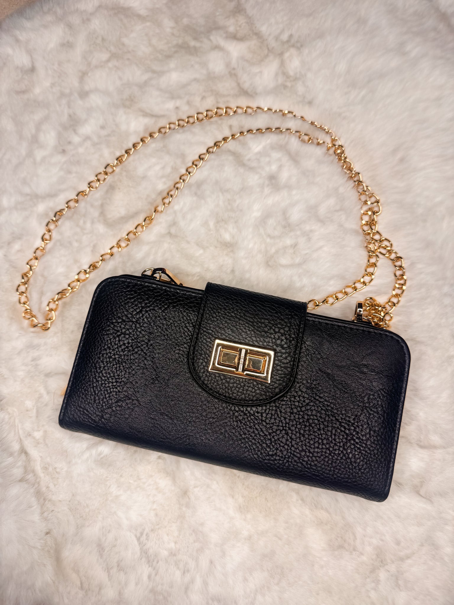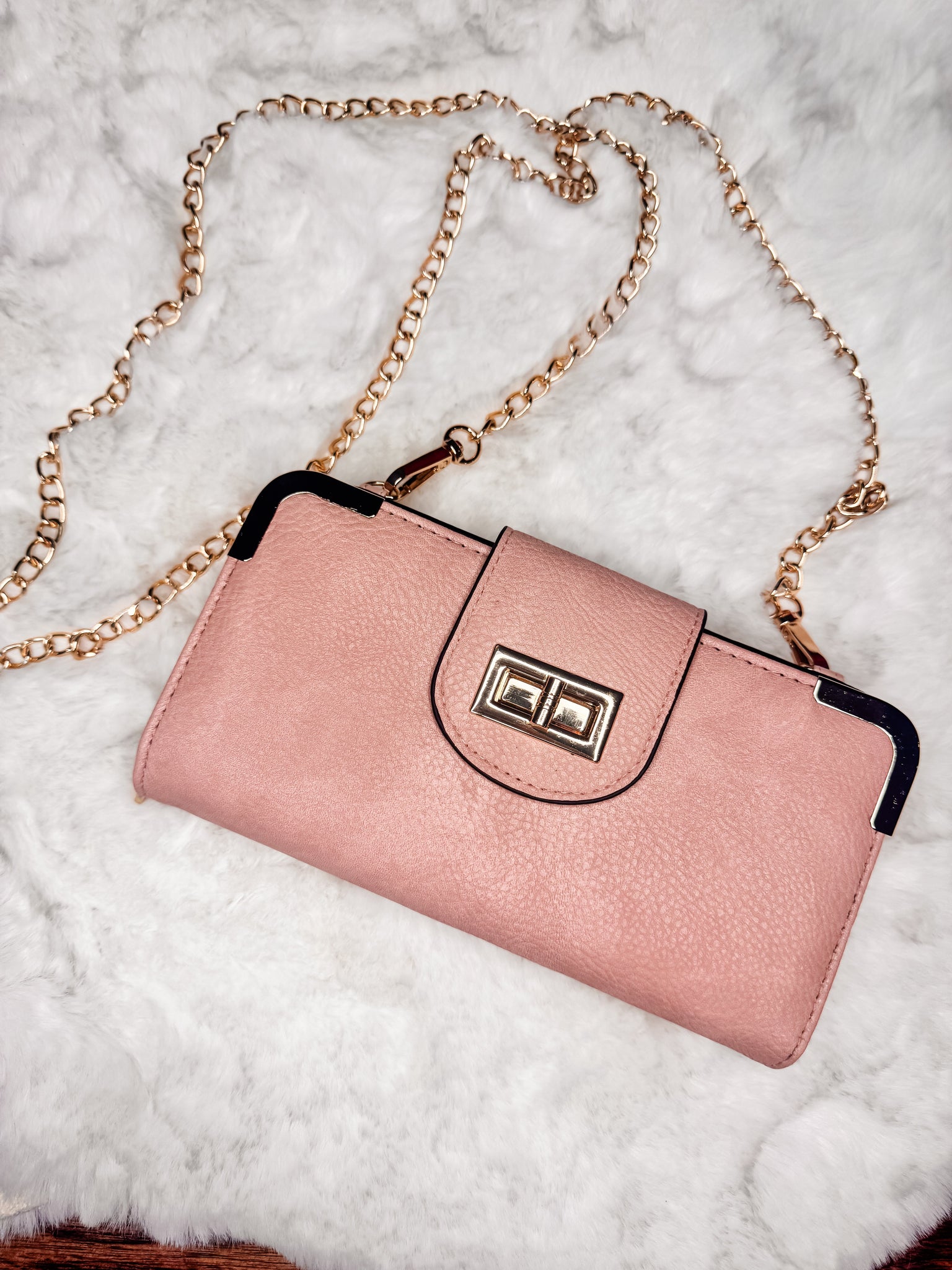 Upgrade your style game with our TURN LOCK CROSSBODY WALLET. This blush and black wallet features a gold turn lock and chain, making it the perfect accessory for any holiday party or casual day. Its versatile design combines fashion with functionality, so you can look your best while staying organized.