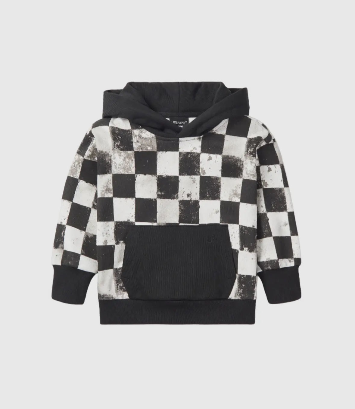 The Checkered Hoodie features a custom print design complemented by ribbed cuffs and hem, enhancing both comfort and style. Its kangaroo pocket offers practical storage, while the mineral wash finish provides a soft texture. This versatile hoodie pairs effortlessly with jeans or joggers, making it suitable for various casual settings.