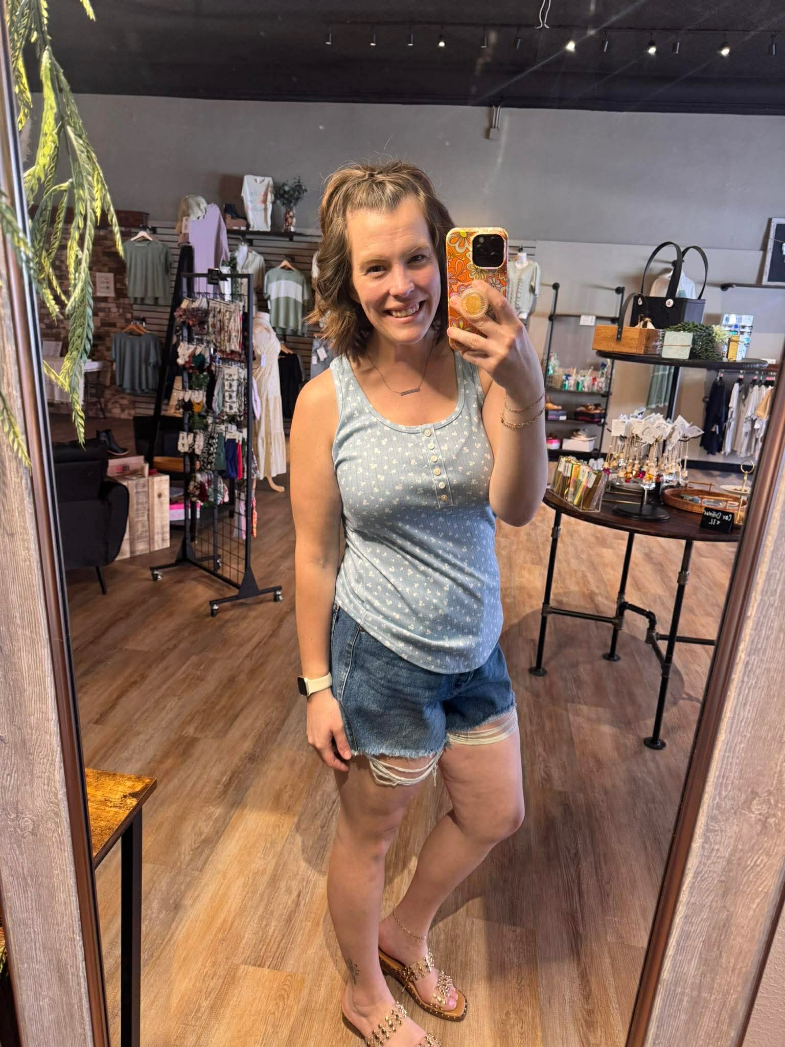 The BABY BLUE WILDFLOWER TANK is crafted from a soft, lightweight fabric that enhances comfort throughout the day. The scoop neck design and ribbed texture provide a flattering silhouette, while the faux buttons and baby blue with white wildflower pattern add a delicate, feminine touch.
