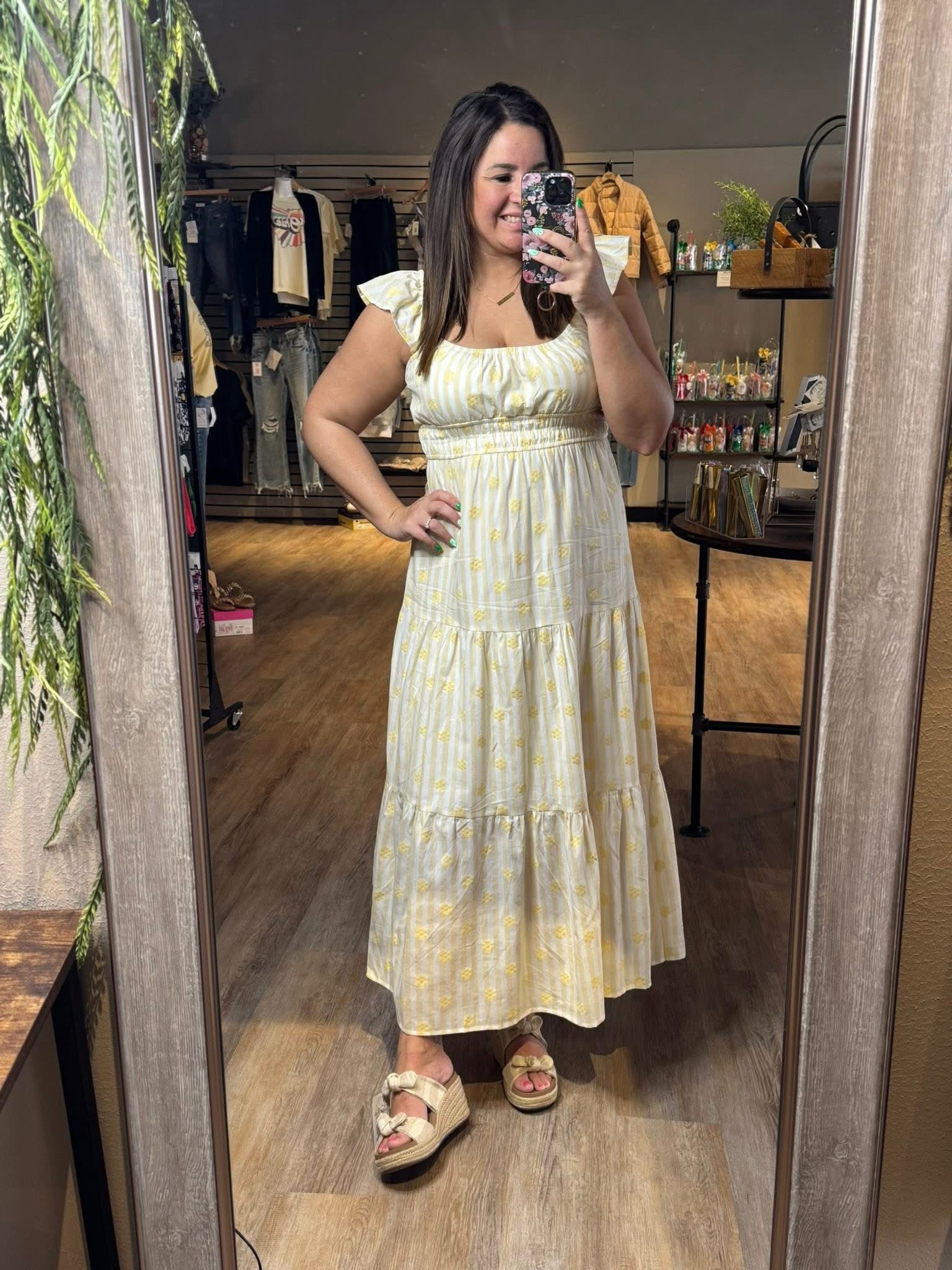 Soft, feminine, and made for sunny days—the Daisy Daydreams Midi Dress is the perfect blend of charm and comfort. Featuring delicate ruffled sleeves and a flattering smocked bodice, this dress hugs in all the right places while offering an easy, flowy fit. The sweet mix of dainty florals and subtle stripe detailing adds a fresh, playful touch, making it a go-to for spring outings, brunch dates, and everything in between.