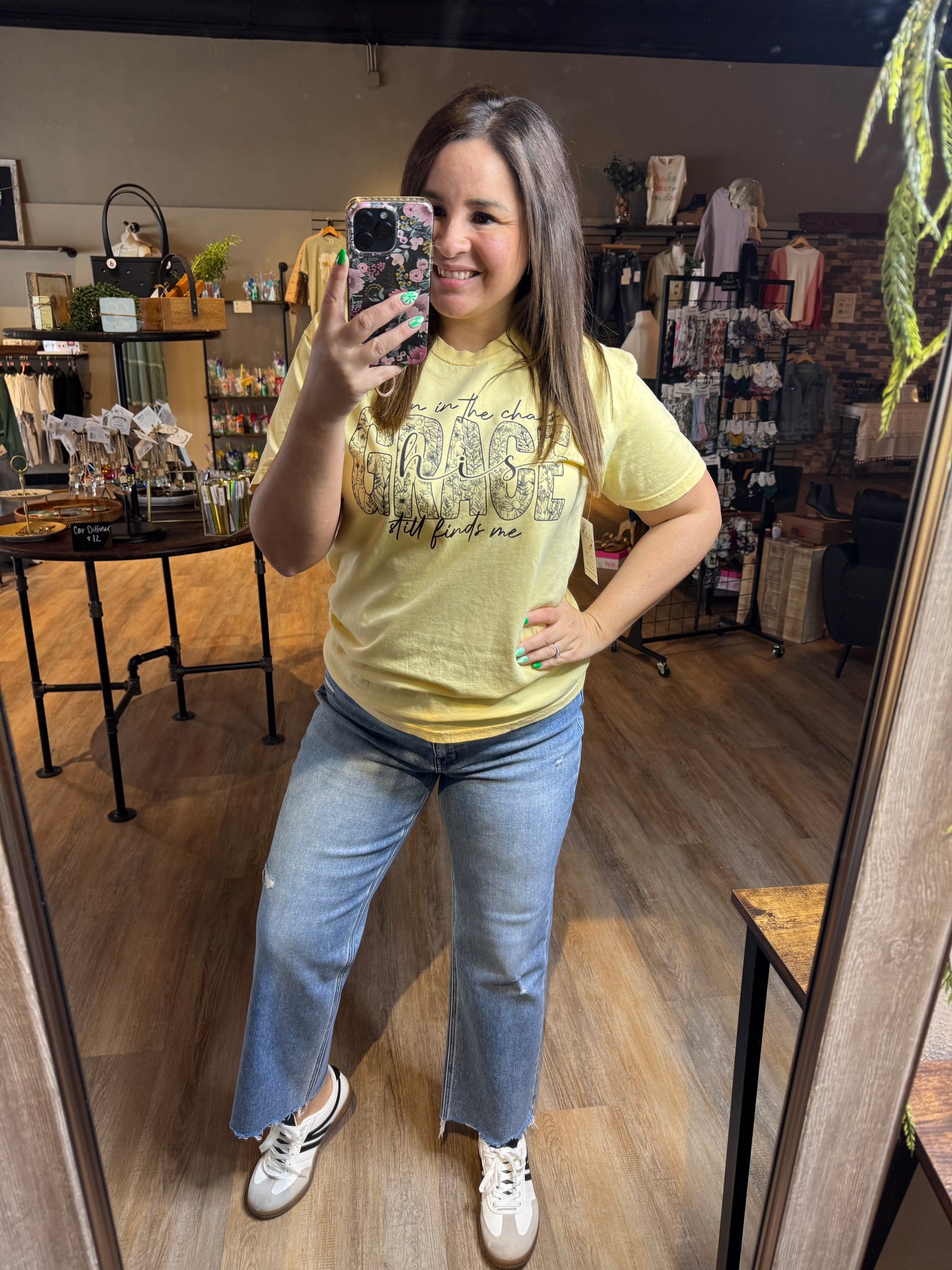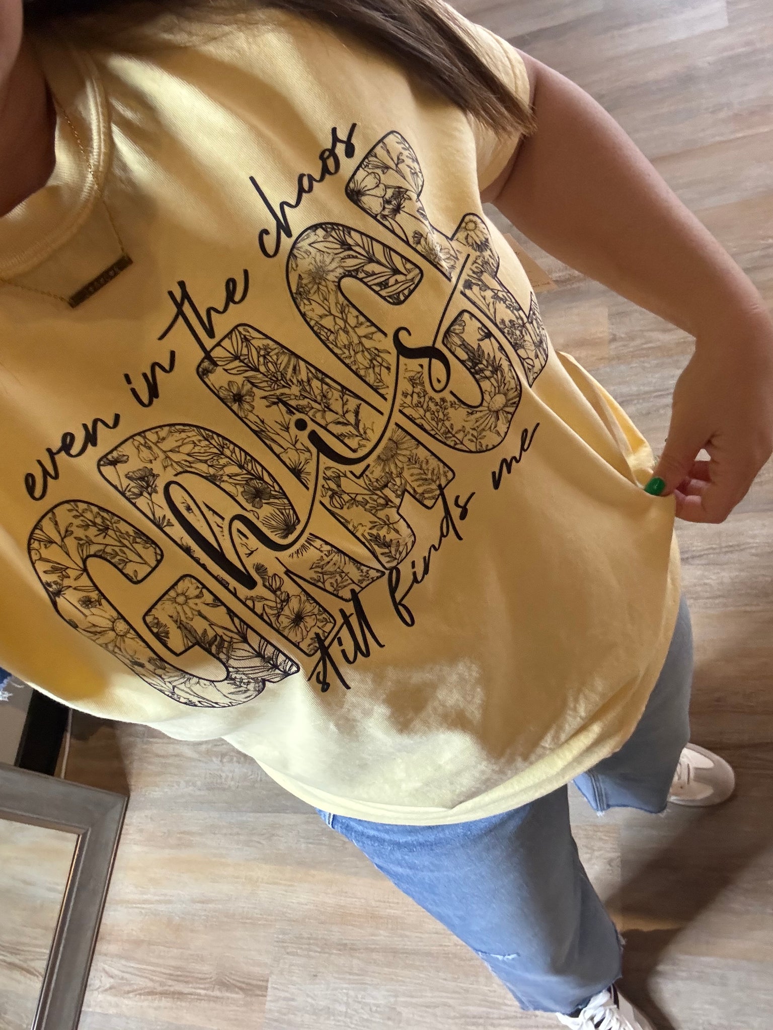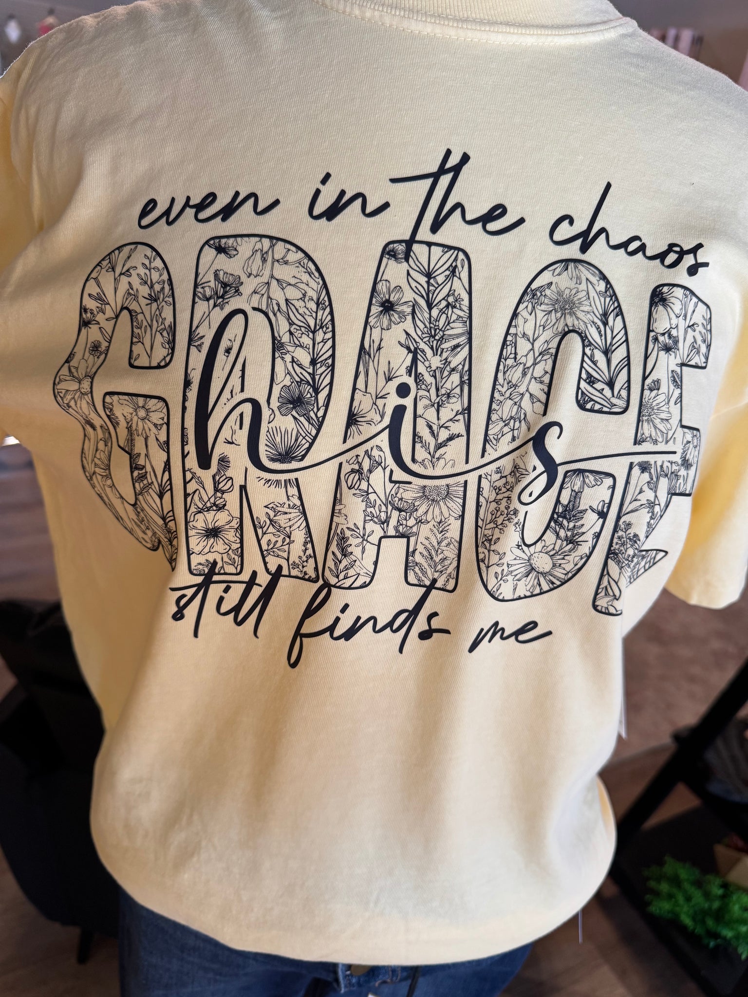 This Comfort Color tee in butter yellow offers both comfort and style, ideal for spring. Featuring the inspirational quote “Even in the chaos his Grace still finds me,” the shirt serves as a motivational reminder, making it suitable for casual wear or as a thoughtful gift.