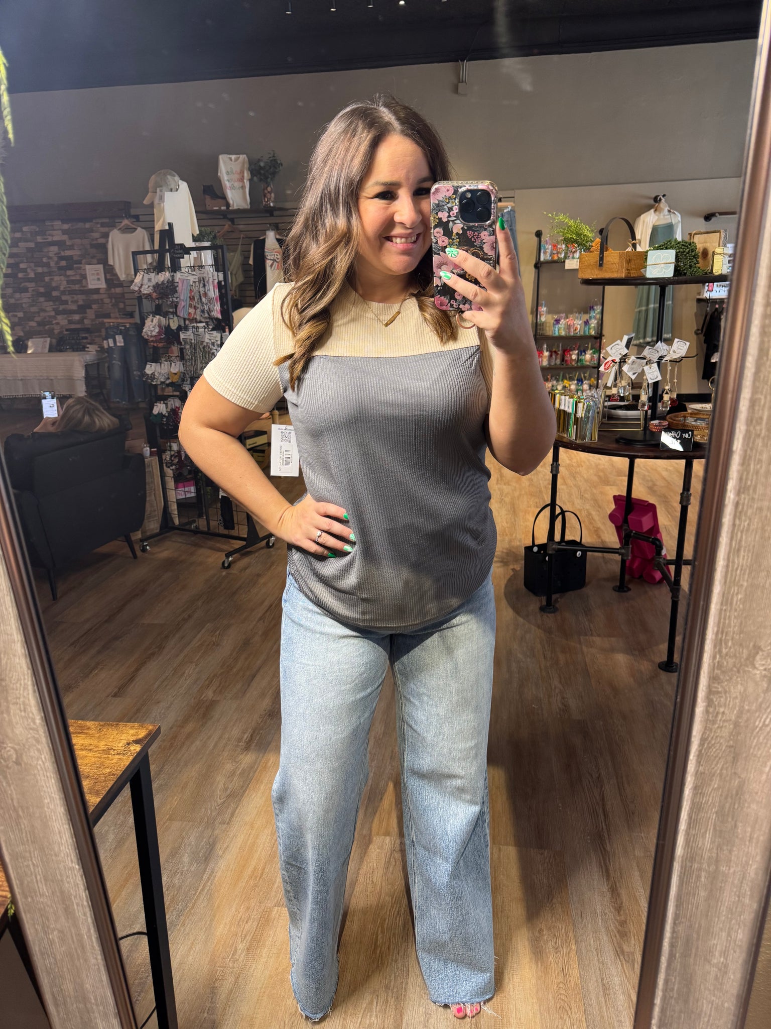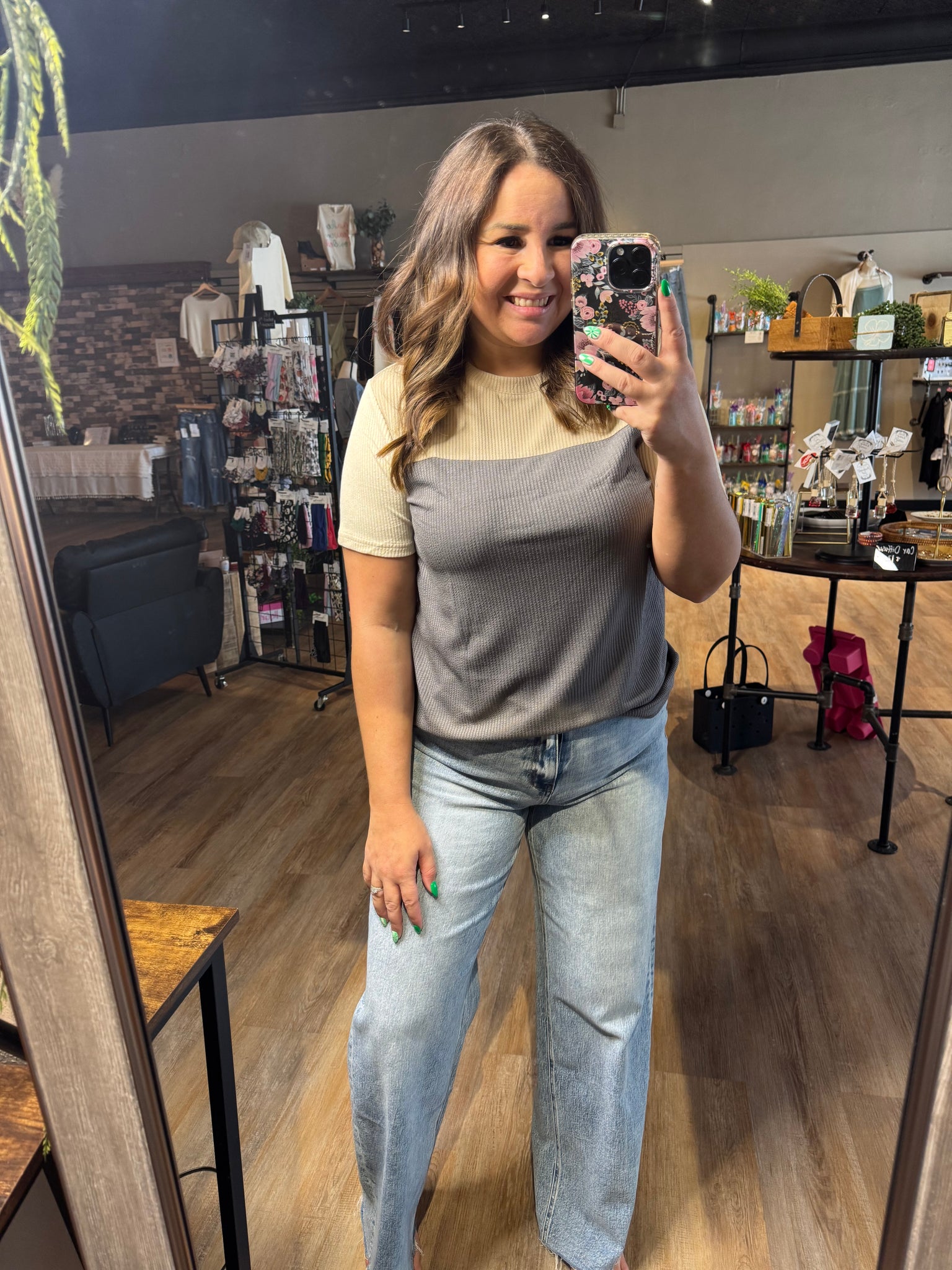 The CORDED NEUTRAL TOP features a versatile ribbed design and a comfortable short sleeve round neck, ideal for casual wear. With a color palette of grey, cream, and light brown, it complements both leggings and jeans, offering a practical yet stylish option for everyday outfits.