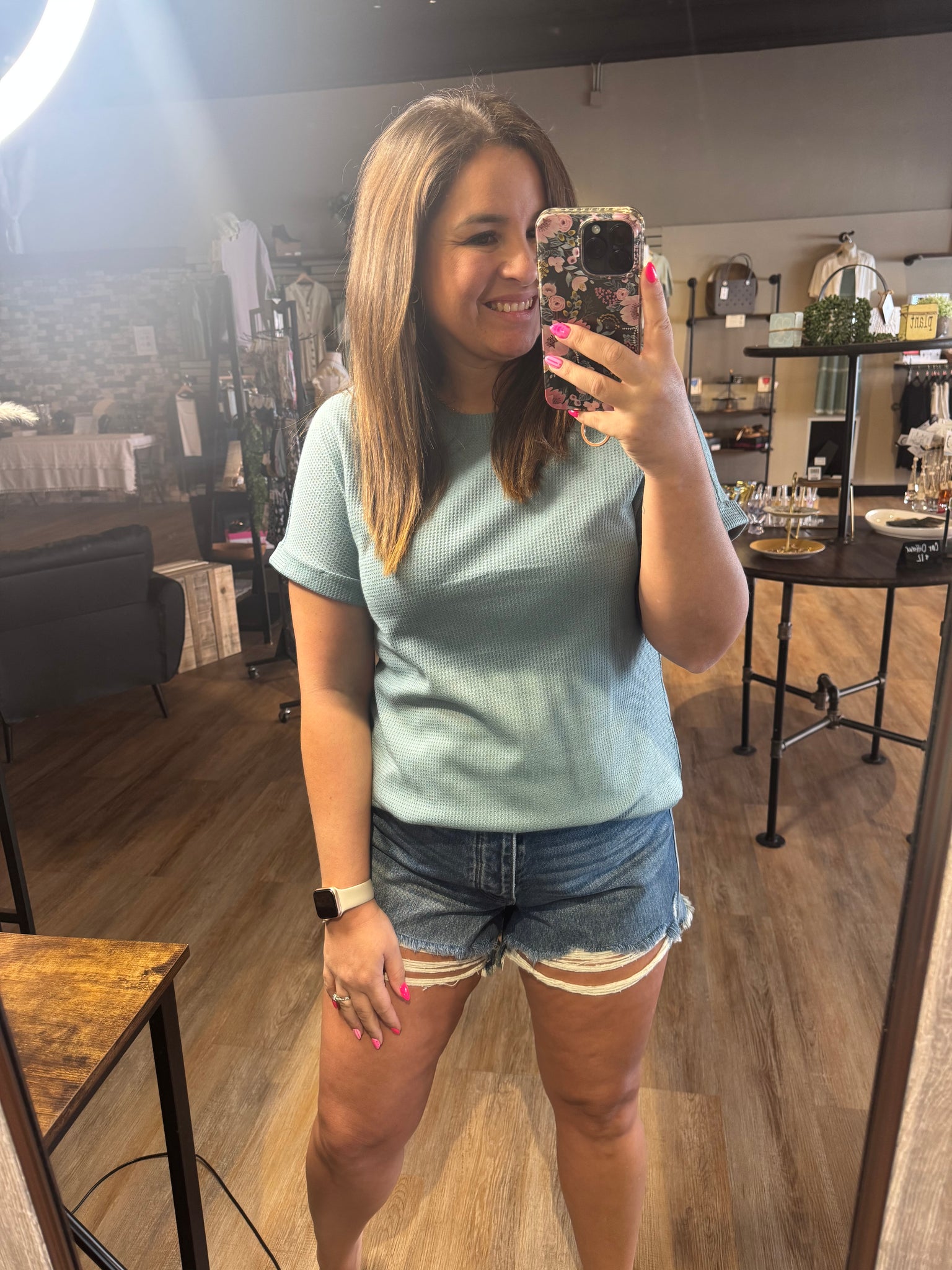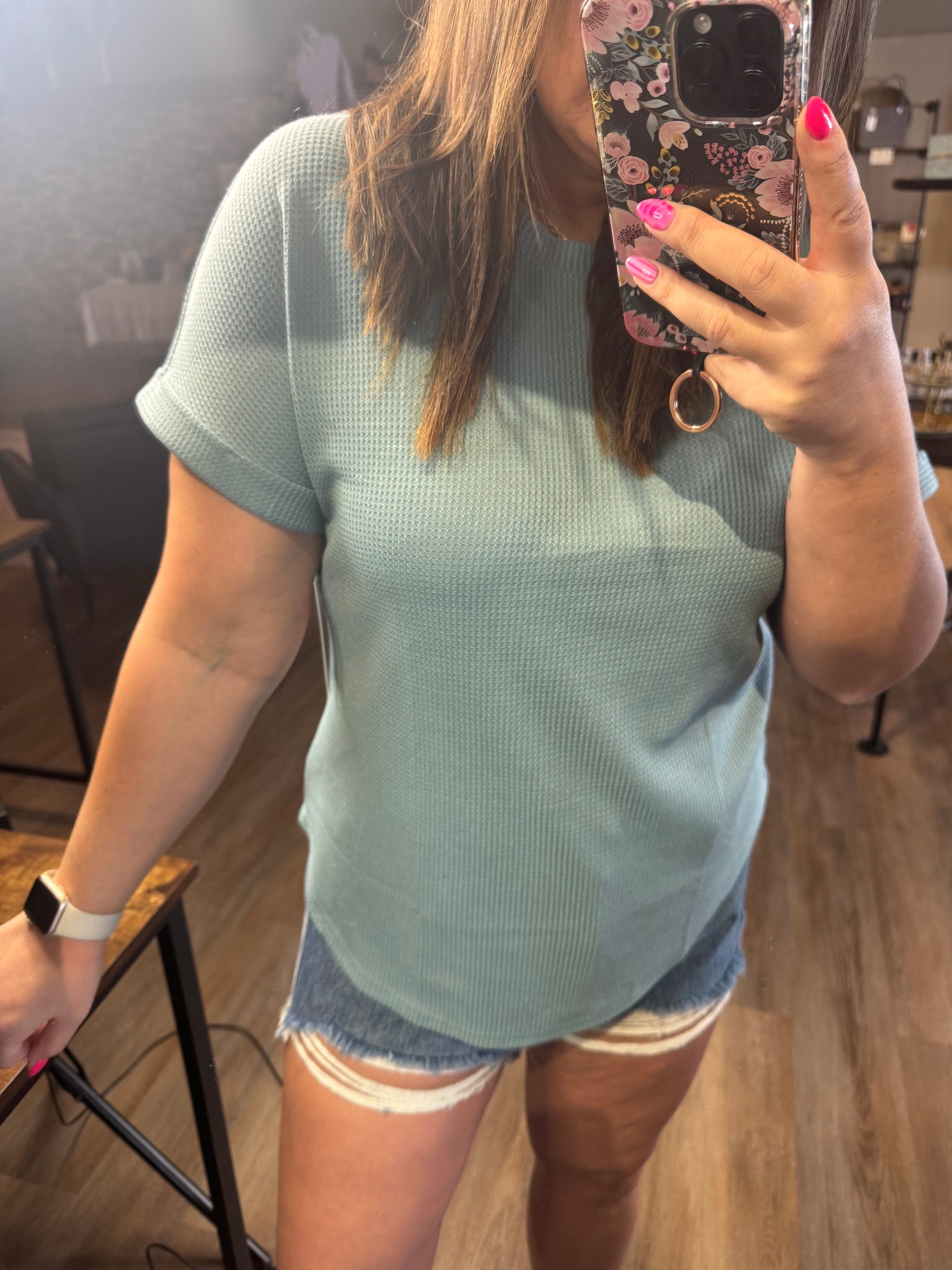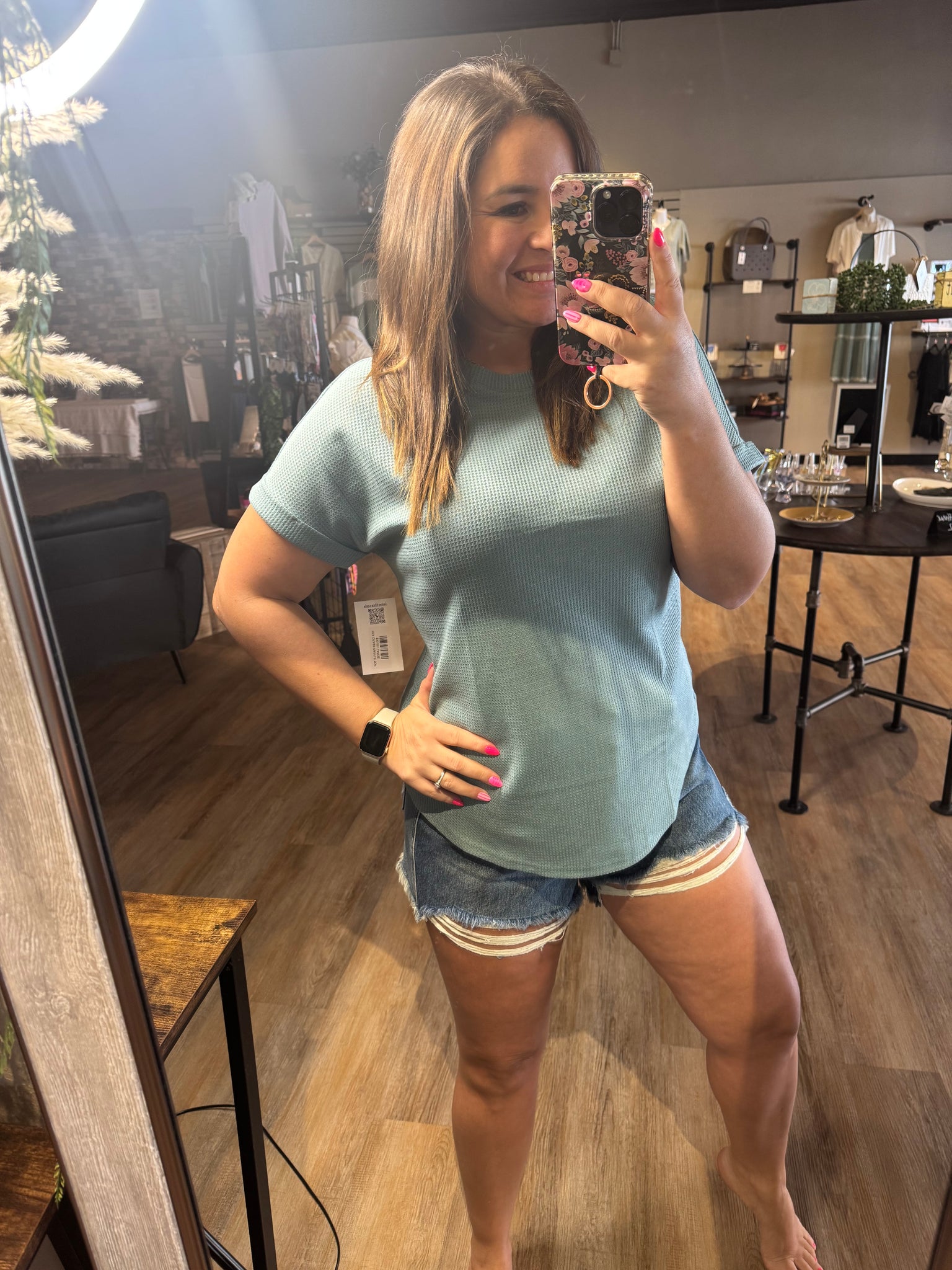 The Sea Grass Waffle Top features a short sleeve design, crafted from a stylish waffle texture. Its round neckline and hem provide a comfortable fit, while the cuff sleeves add structure. This blend of style and functionality makes it suitable for a variety of casual settings.