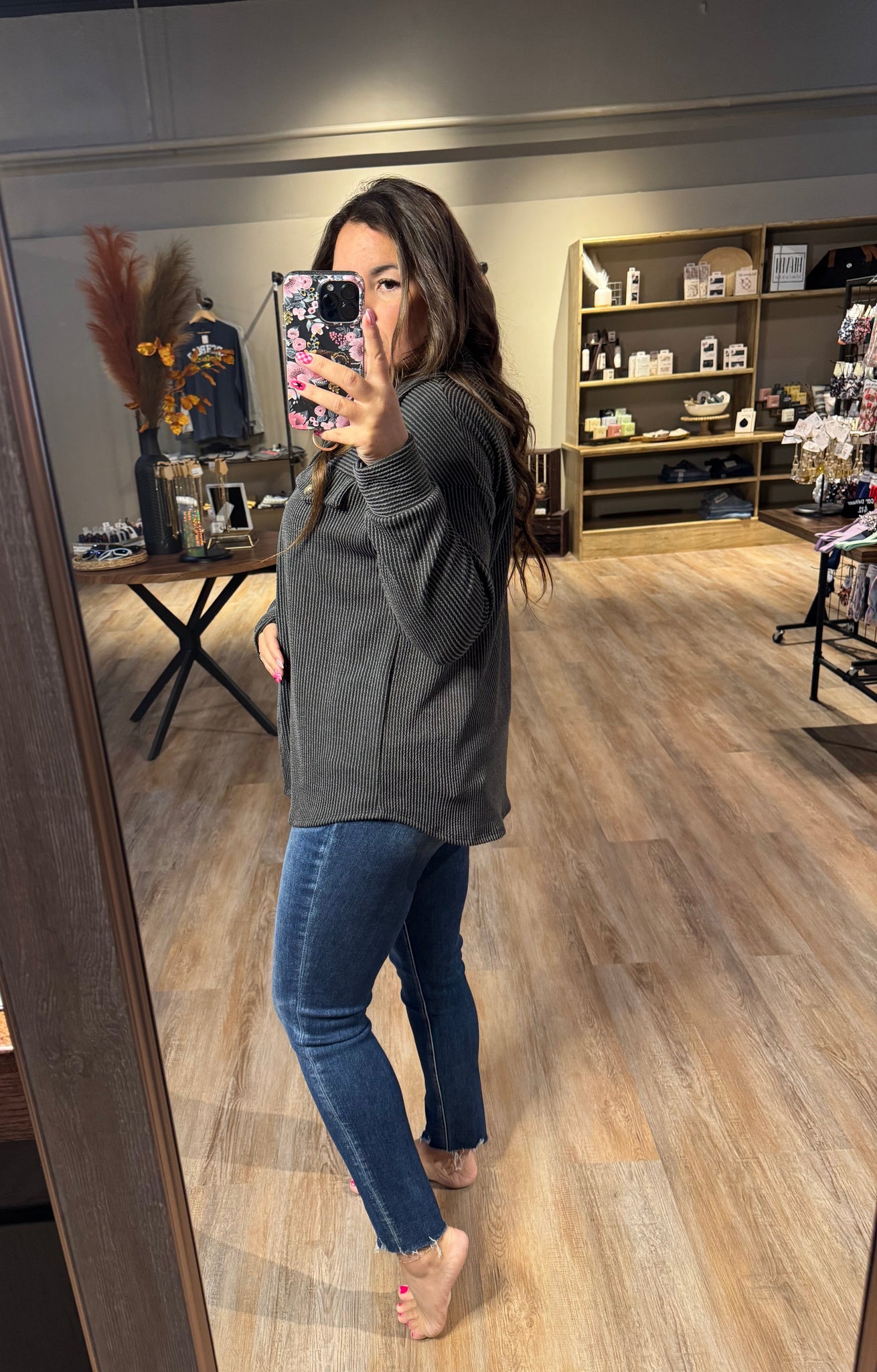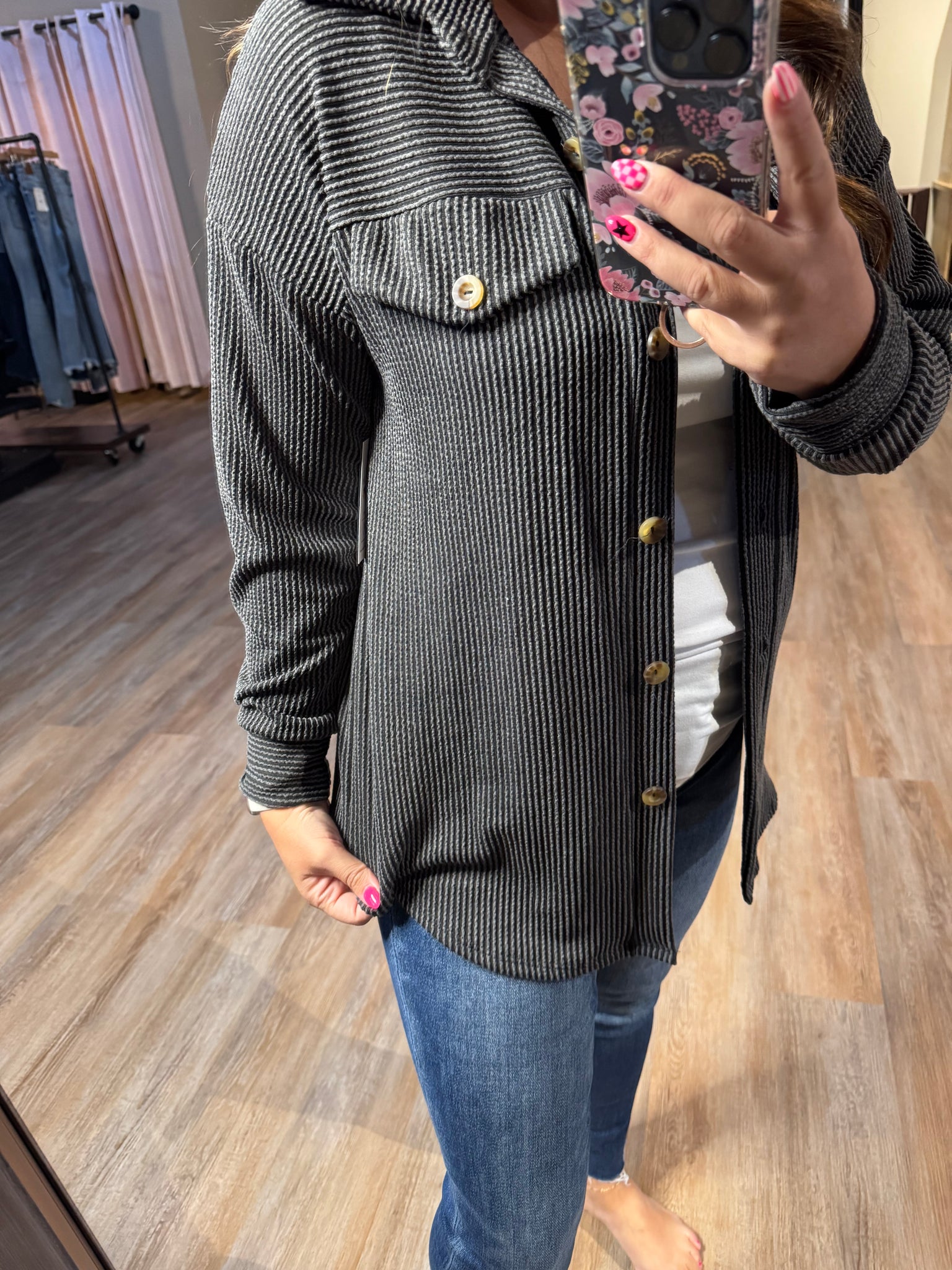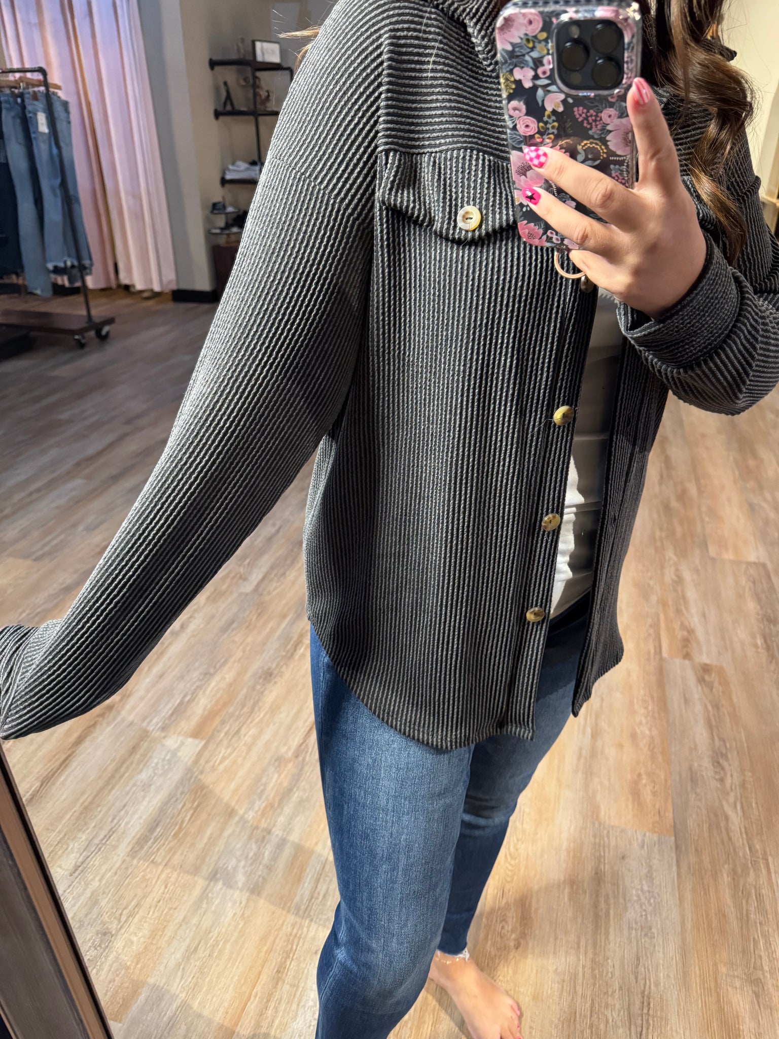 Effortlessly upgrade your fall wardrobe with our charcoal Corded Shacket. Featuring a lightweight design and cozy ribbed drop shoulder detailing, this button down shacket is a must have for both comfort and style. Stay on-trend while staying warm this season.
