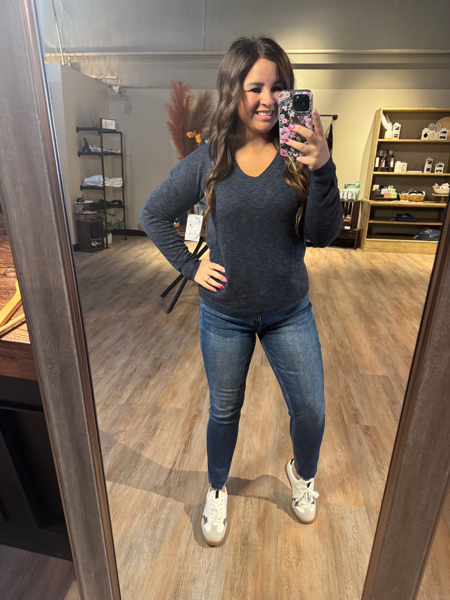 As a must-have addition to your closet, the Charcoal Knit Sweater with hints of navy tones offers a lightweight, breathable and comfortable option for everyday wear. Crafted from soft cotton slub, this v-neckline sweater combines style and comfort. Whether you're out and about or relaxing at home, this sweater is the perfect choice for any occasion.