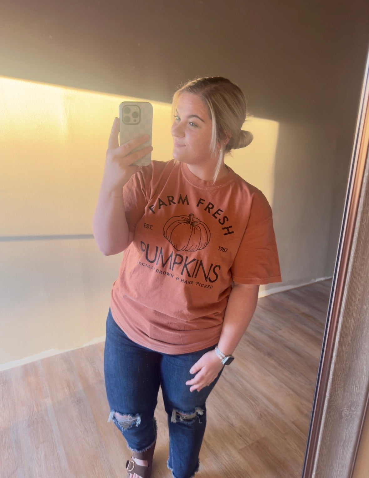 Cozy up for fall in this soft Comfort Colors graphic tee! Featuring a “Farm Fresh Pumpkins” design on a yam color, it’s the perfect casual piece for all your autumn outings.