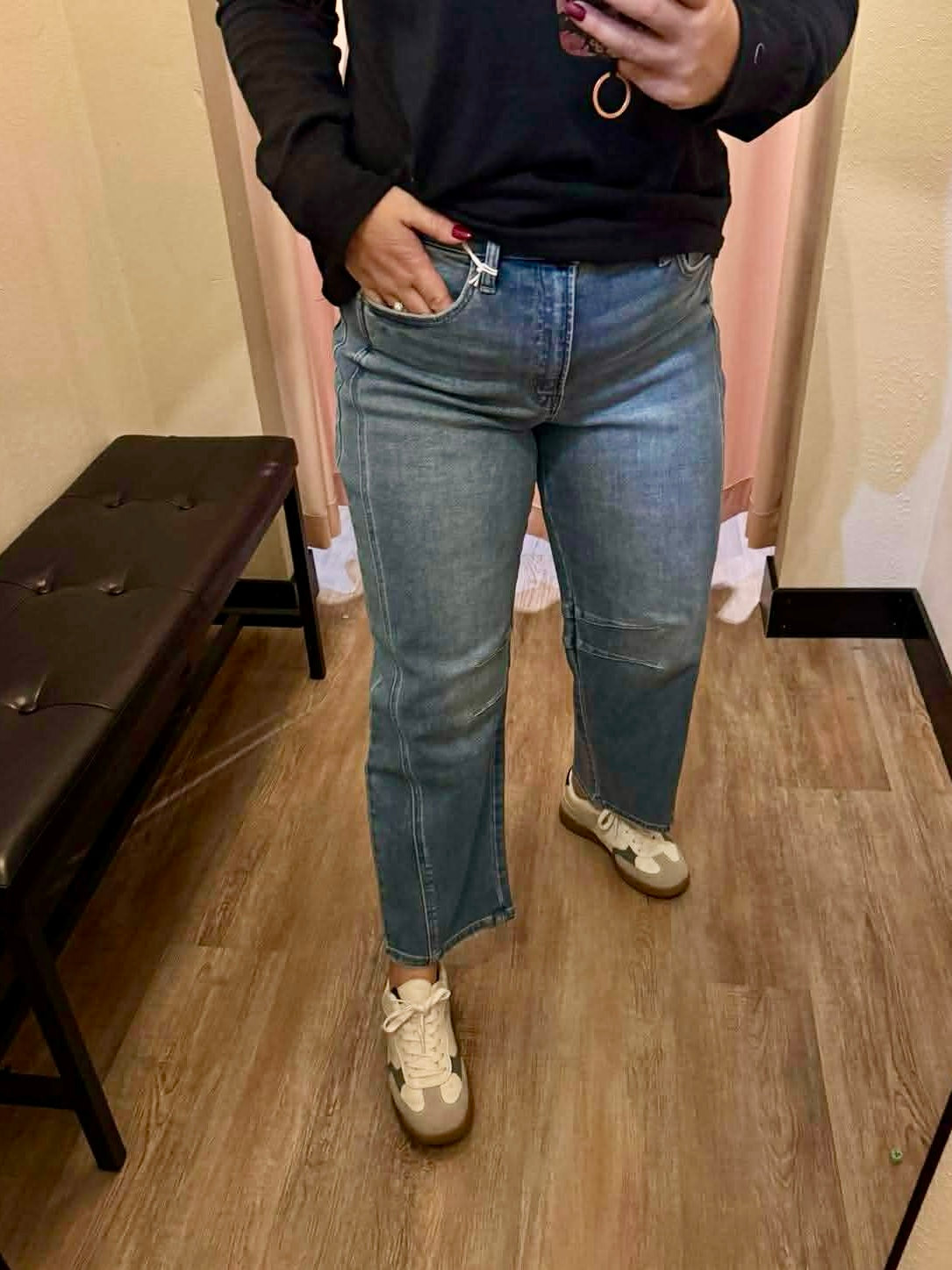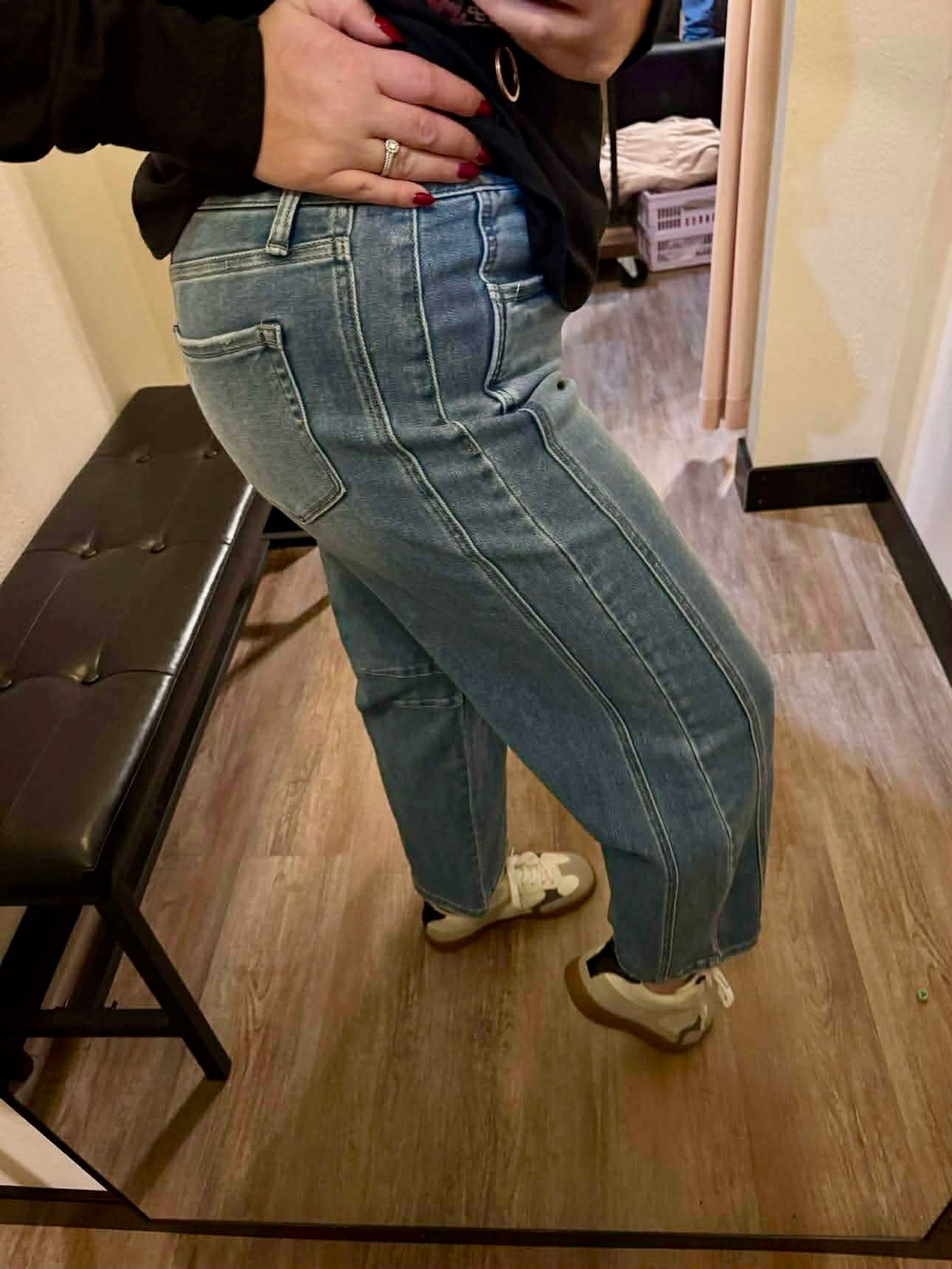 The vervet KATE HIGH RISE BARREL is a stylish and versatile pair of jeans. With a mid-high rise and no distressing, they provide a comfortable and sleek fit. The panelled seam detailing and raw edge frayed hem add a trendy touch, while the shorter inseam and minimal stretch offer a flattering silhouette. Perfect for any occasion, these jeans feature a zip fly with button closure and a barrel leg design.
