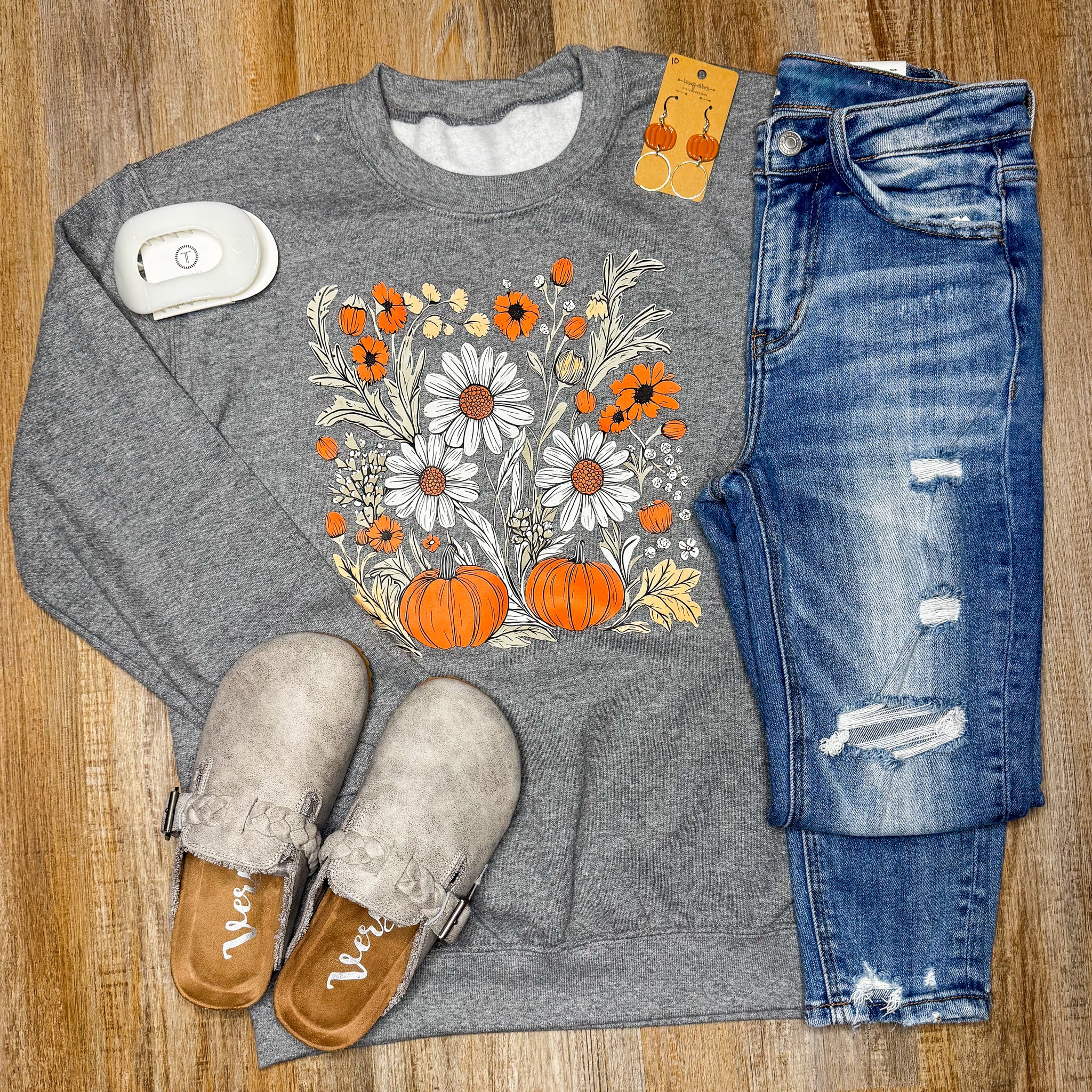 The Petals and Pumpkins Crewneck is a cozy gray sweatshirt featuring a charming fall design of bright pumpkins and cheerful florals. Perfect for adding a touch of autumn style to your everyday look!