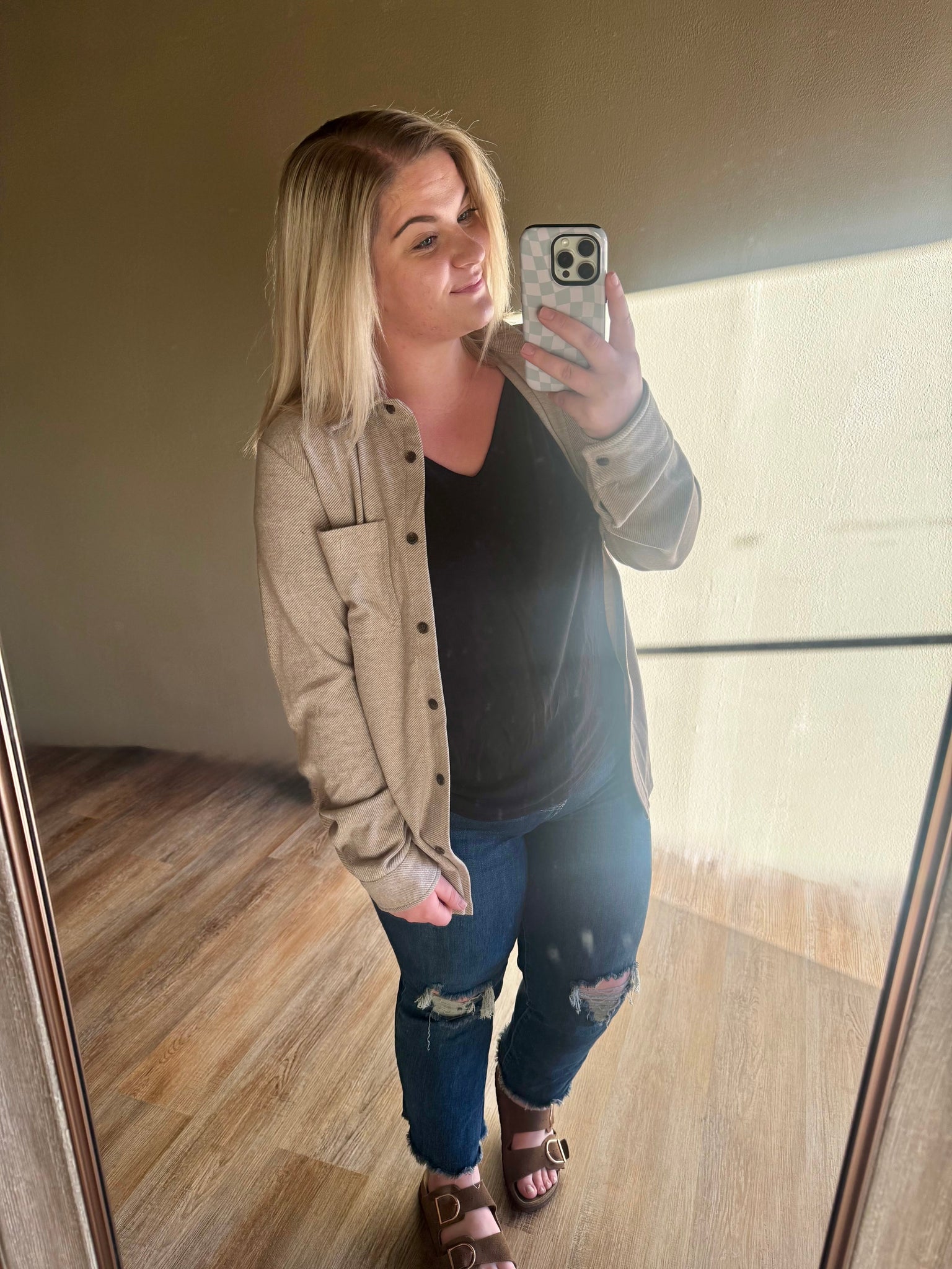 Introducing the TARYN TAUPE SHACKET - your new go-to for effortless style. The herringbone design provides a versatile everyday look that combines comfort and sophistication. Elevate your wardrobe with this must-have piece.