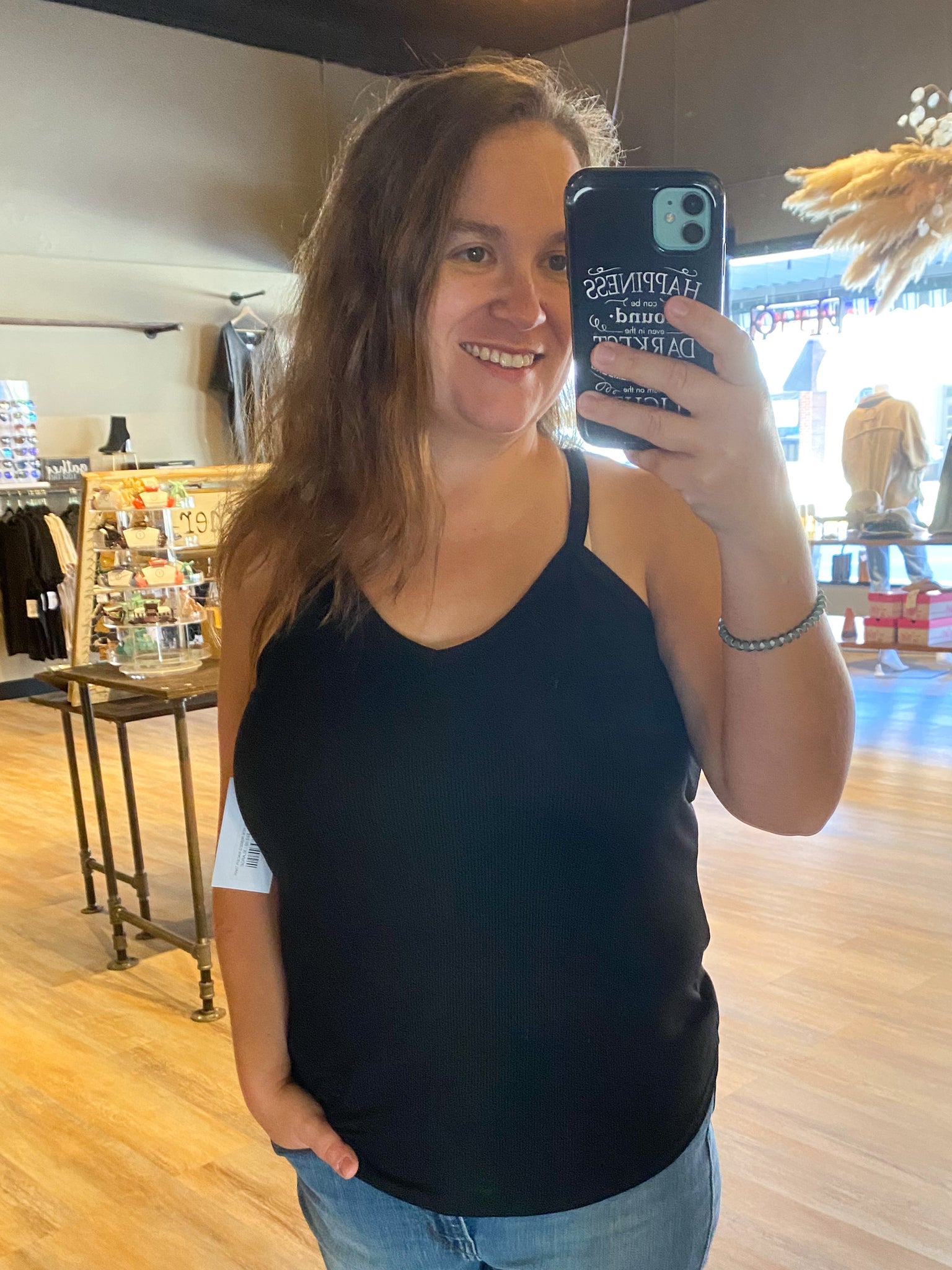 Expertly crafted for both comfort and style, our Black Ribbed Racer Tank is a must-have in any wardrobe. Its ribbed texture and v neck design flatter every figure while providing a snug and supportive fit. The rounded hem adds a touch of sophistication, making this tank perfect for any occasion.